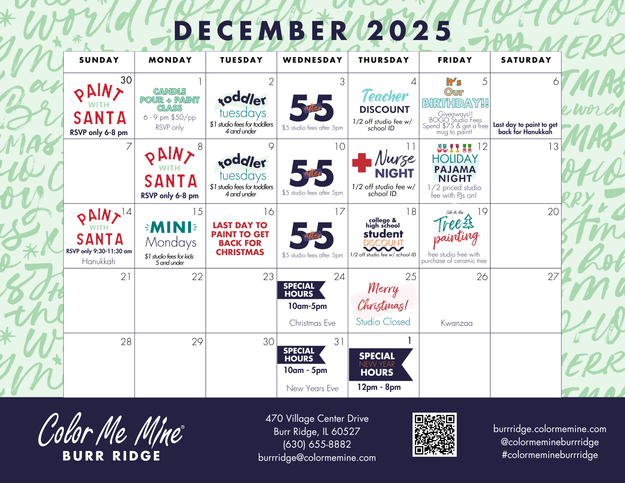 The most wonderful (and colorful!) time of the year is here, and we’ve packed December full of festive fun for the whole family! From our 1st Birthday under new ownership to Paint with Santa and a cozy Candle Pour + Paint Night, there’s something for everyone to enjoy this season at Color Me Mine Burr Ridge.